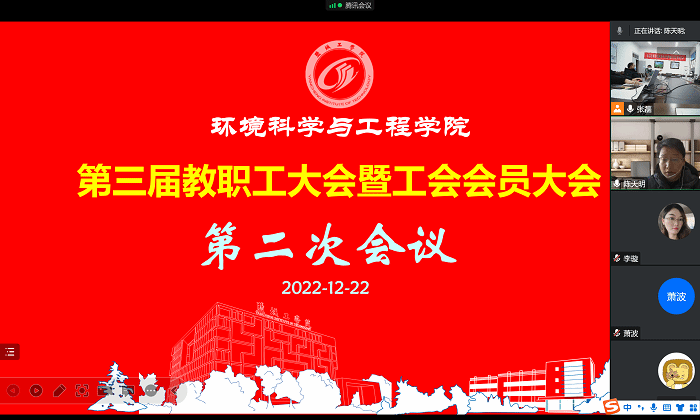 12月22日下午,在北校区大学生活动中心三楼会议室,环境学院召开第三届第二次教职工代表大会暨工会会员代表大会。会议采取线上线下相结合的方式进行,由学院党总支书记陈阳主持,全体教职工、工会会员参加。