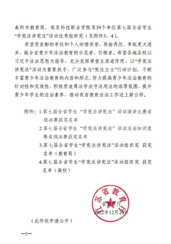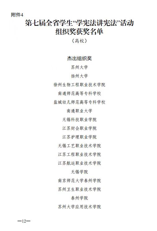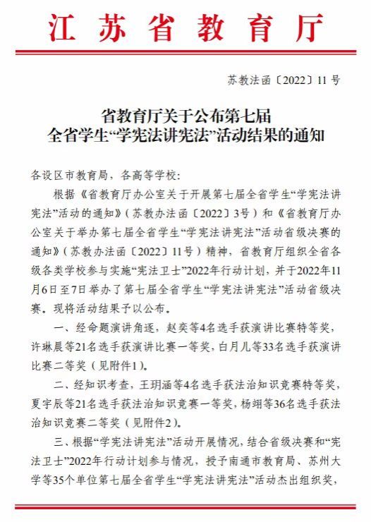 近日,省教育厅公布了第七届全省学生“学宪法讲宪法”活动评选结果(苏教法函〔2022〕11号 ),我校荣获高校组“杰出组织奖”,这是我校荣获第六届全省学生“学宪法讲宪法”活动高校组“优秀组织奖”之后再次获得组织奖。