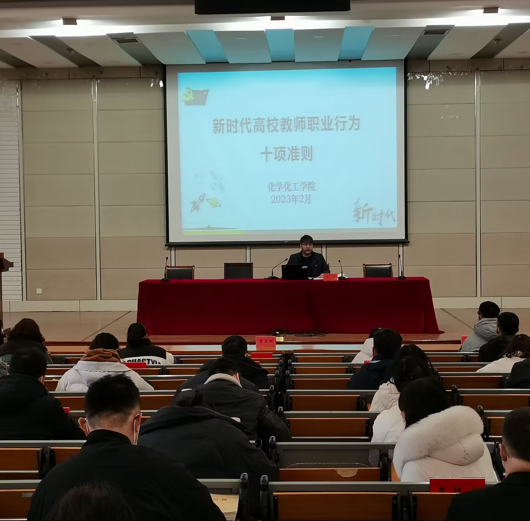 为进一步增强教师的责任感、使命感,弘扬新时代高校教师道德风尚,努力建设有理想信念、有道德情操、有扎实学识、有仁爱之心的高校教师队伍,2月22日下午,化学化工学院在北校区化工楼报告厅召开春学期第一次全体教职工政治理论学习会,深入学习《新时代高校教师职业行为十项准则》(以下简称《十项准则》)。本次学习会由学院党委副书记庞辉主讲,学院领导班子成员和全体教职工参加。