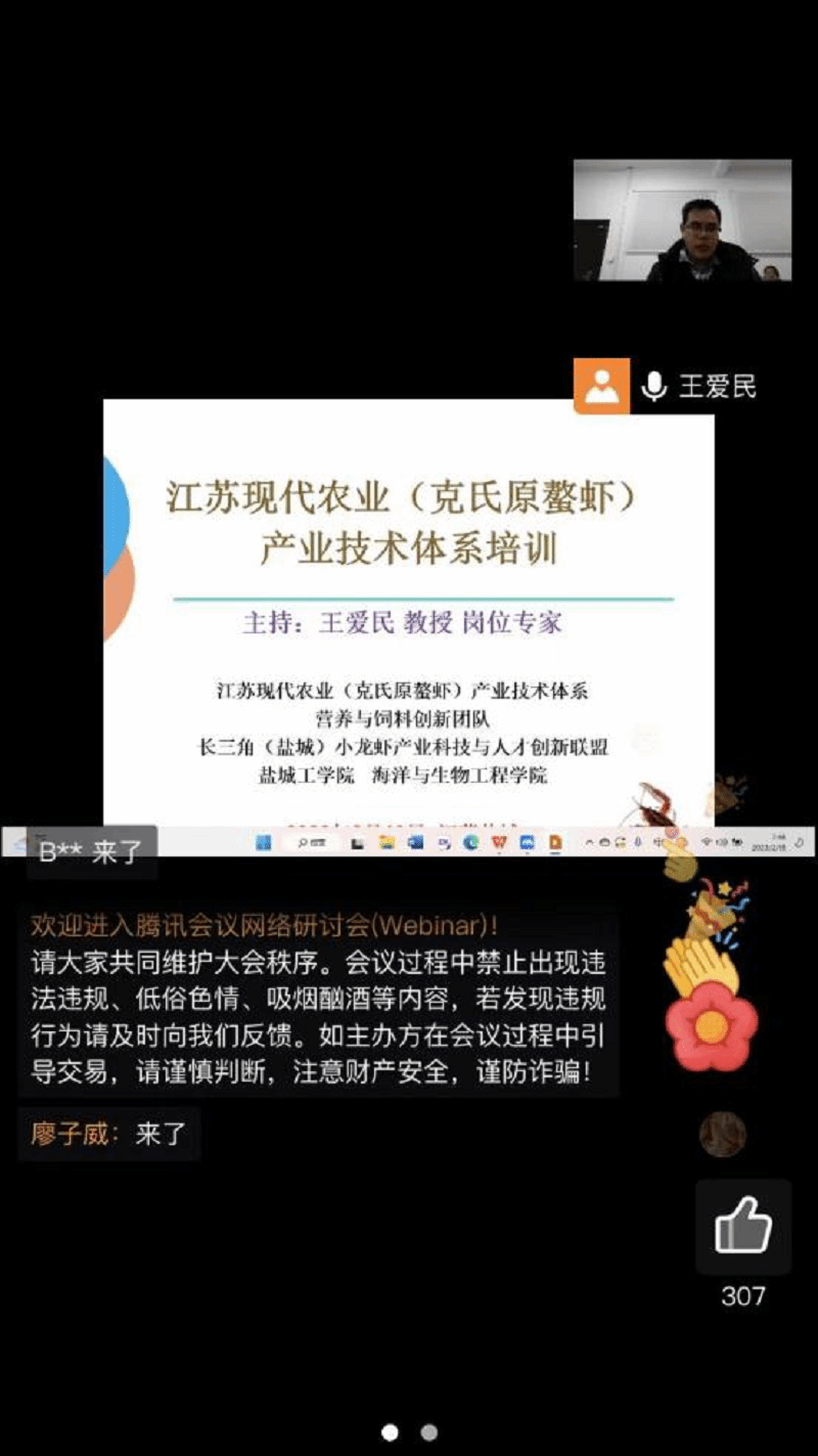 为提升水产从业人员小龙虾(克氏原螯虾)养殖技术水平,推动小龙虾产业健康发展,在江苏现代农业产业技术体系的大力支持下,2月18日,体系营养与饲料创新团队、盐城工学院海生学院和长三角(盐城)小龙虾产业科技与人才创新联盟联合,线上线下结合共同举办了盐城市小龙虾健康养殖技术培训会。