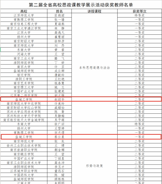 近日,江苏省第二届高校思政课教学展示活动决赛在常州举行。我校马克思主义学院蔡云晨、赵迎华老师分别荣获“形势与政策”课教学展示一等奖和“思想道德与法治”课教学展示二等奖。