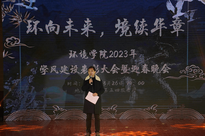3月26日晚,环境学院在建军东路校区五四报告厅举办“环向未来,境续华章”2023年学风建设表彰大会暨迎春晚会。环境学院党总支书记陈阳、副院长杨百忍、党总支副书记周政出席,师生代表及2022全体新生等400余人参加。