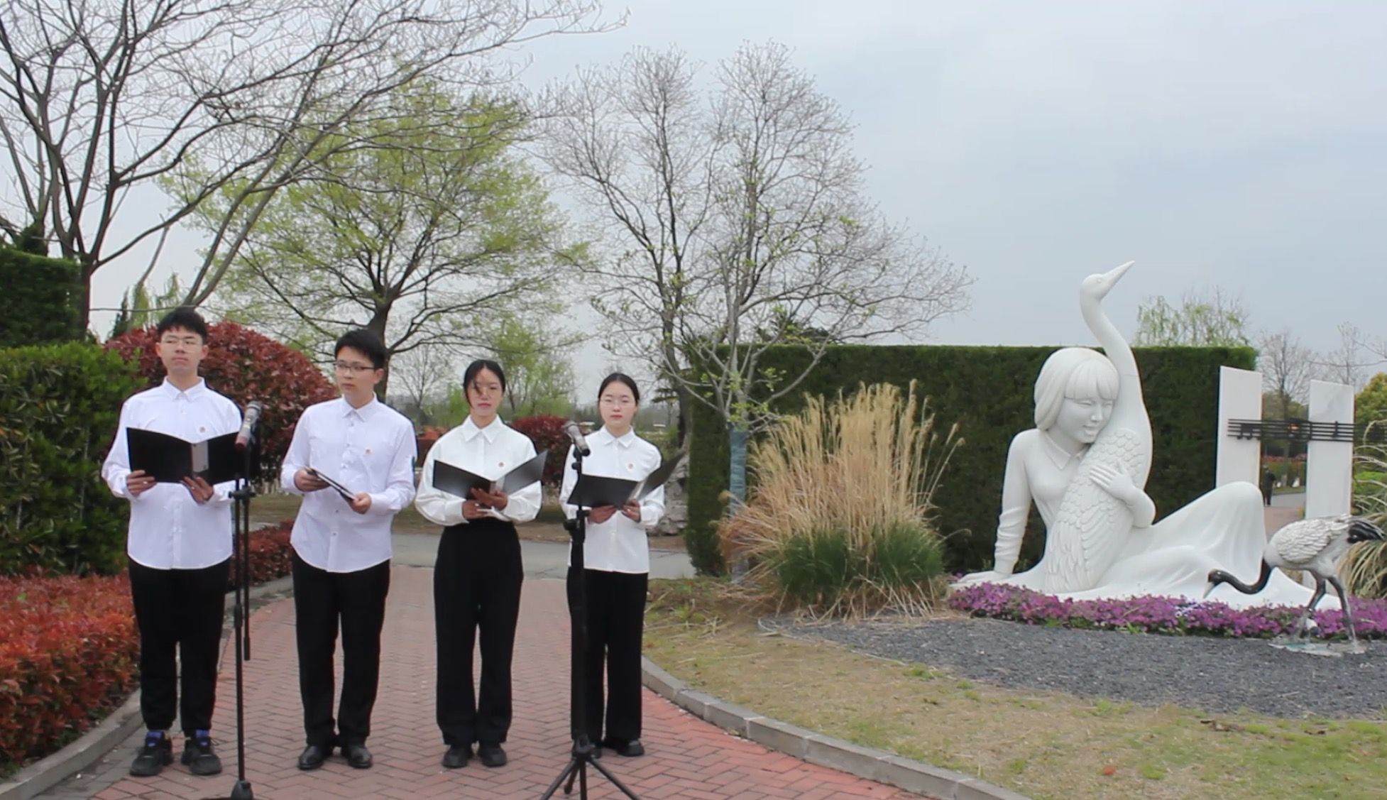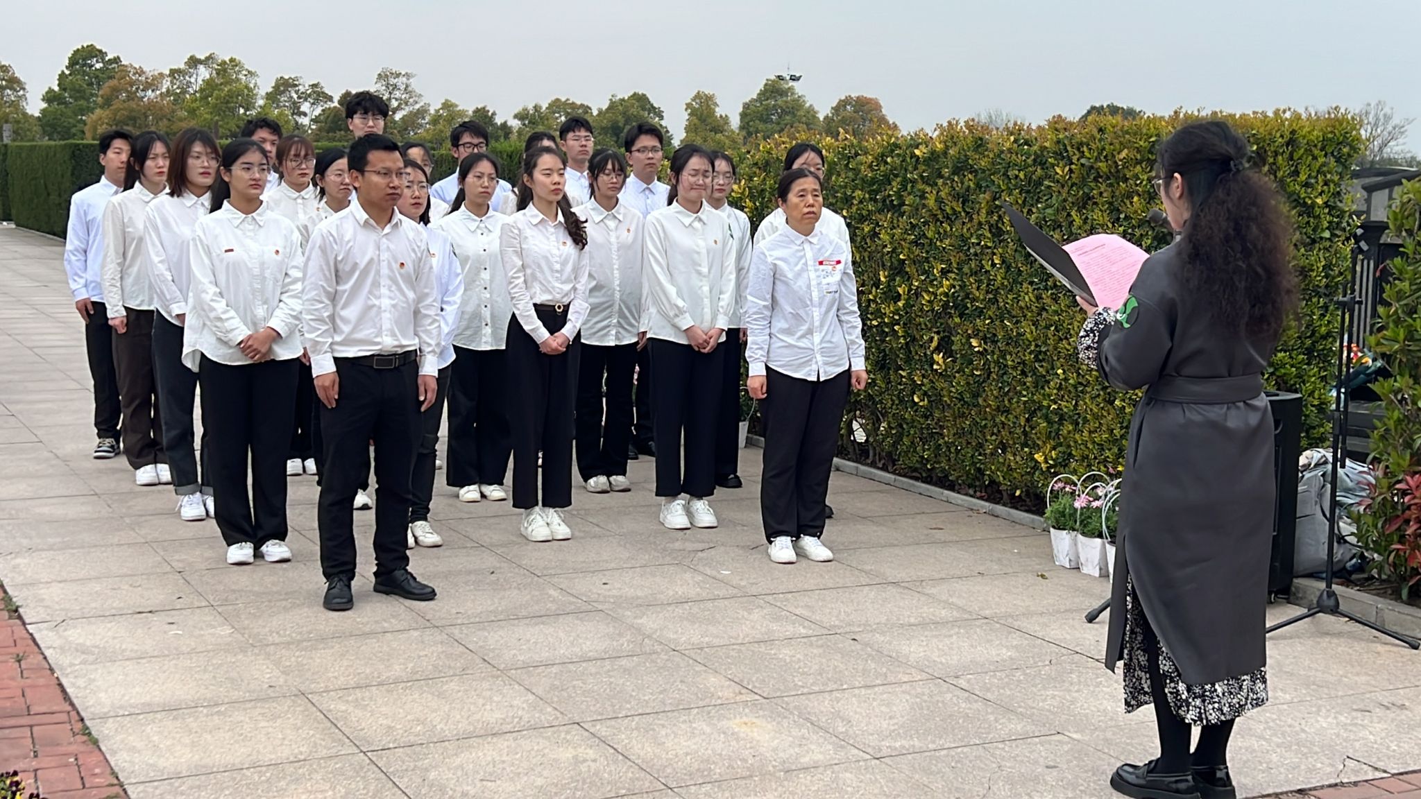 “三十多年前,为了追寻失散的白天鹅,年仅23岁的徐秀娟淹没在沼泽中,将年轻的生命永远留在了这片她深深眷恋的土地上。”活动伊始,陵园工作人员为在场师生详细讲述了徐秀娟的英雄故事。随后,志愿者代表深情朗诵诗歌《一个真实的故事》,全体师生统一着装,排列整齐,庄严肃立,向徐秀娟烈士表达浓浓的哀思之情。