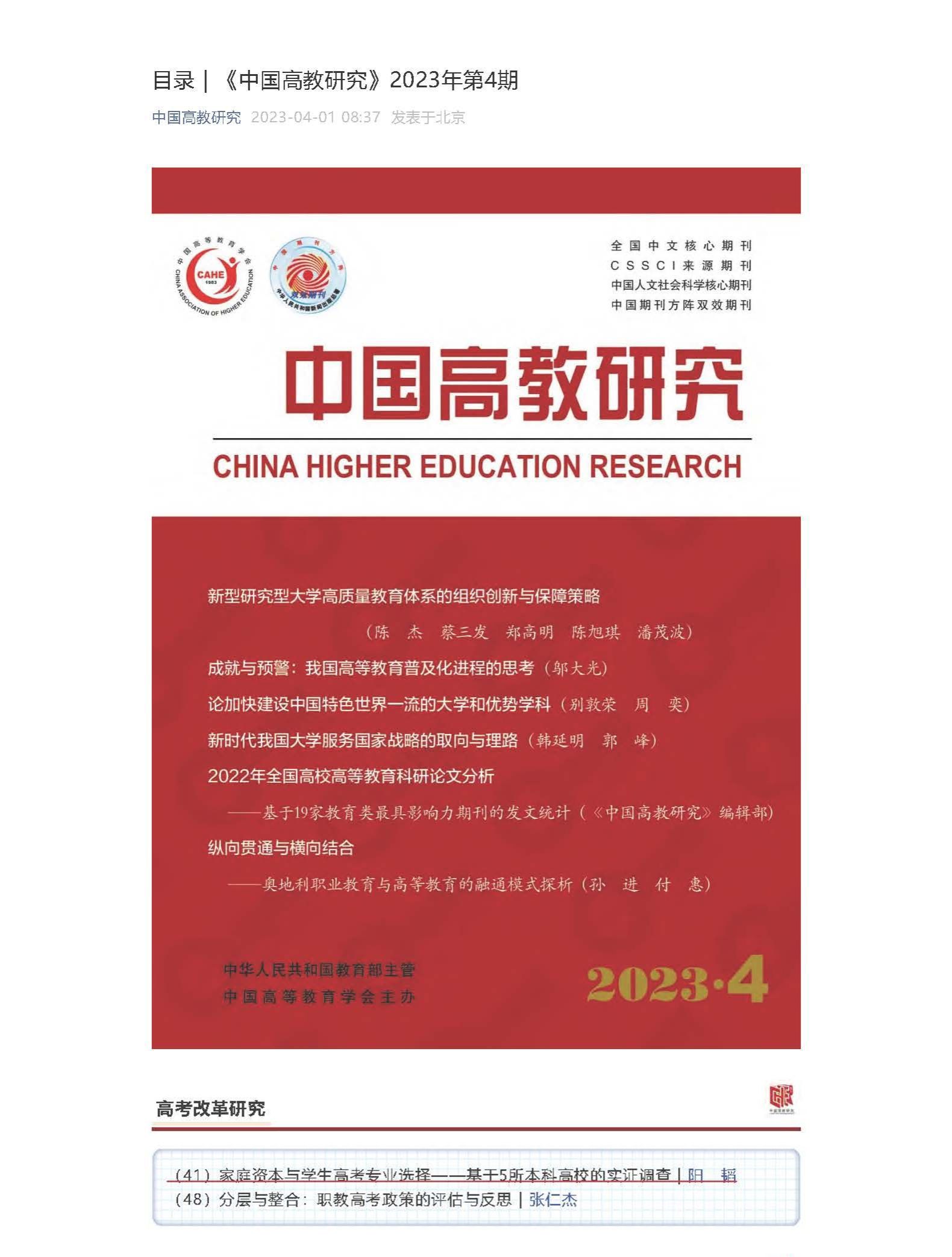 近日,我校学生处招生工作科科长阳韬老师独作、以盐城工学院为第一单位在《中国高教研究》期刊上发表题为《家庭资本与学生高考专业选择——基于5所本科高校的实证调查》的学术论文。《中国高教研究》是由教育部主管、中国高等教育学会主办的CSSCI来源期刊,该期刊为全国14家教育类最具影响力期刊排名第二的期刊,2022年影响因子为5.526。