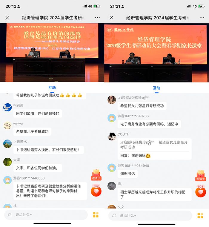 许多家长在直播评论区分享心得,感谢学院和老师们对孩子的关爱和鼓励,有的家长在评论区祝福自己的孩子考研成功,有的家长和孩子干脆在评论区互动喊话,尽显家长的舔犊情深和孩子的感恩之情。