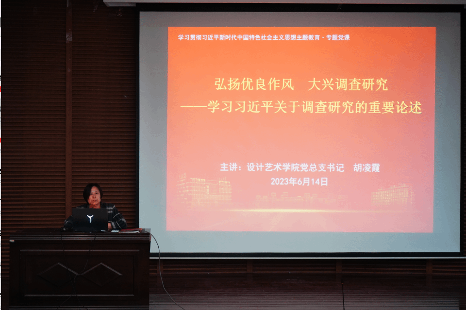 为深入开展学习贯彻习近平新时代中国特色社会主义思想主题教育,6月14日下午,在南校区润美楼报告厅,设计艺术学院党总支书记胡凌霞以《弘扬优良作风 大兴调查研究——学习习近平关于调查研究的重要论述》为题讲授专题党课。学院师生党员和部分骨干教师参加党课学习。