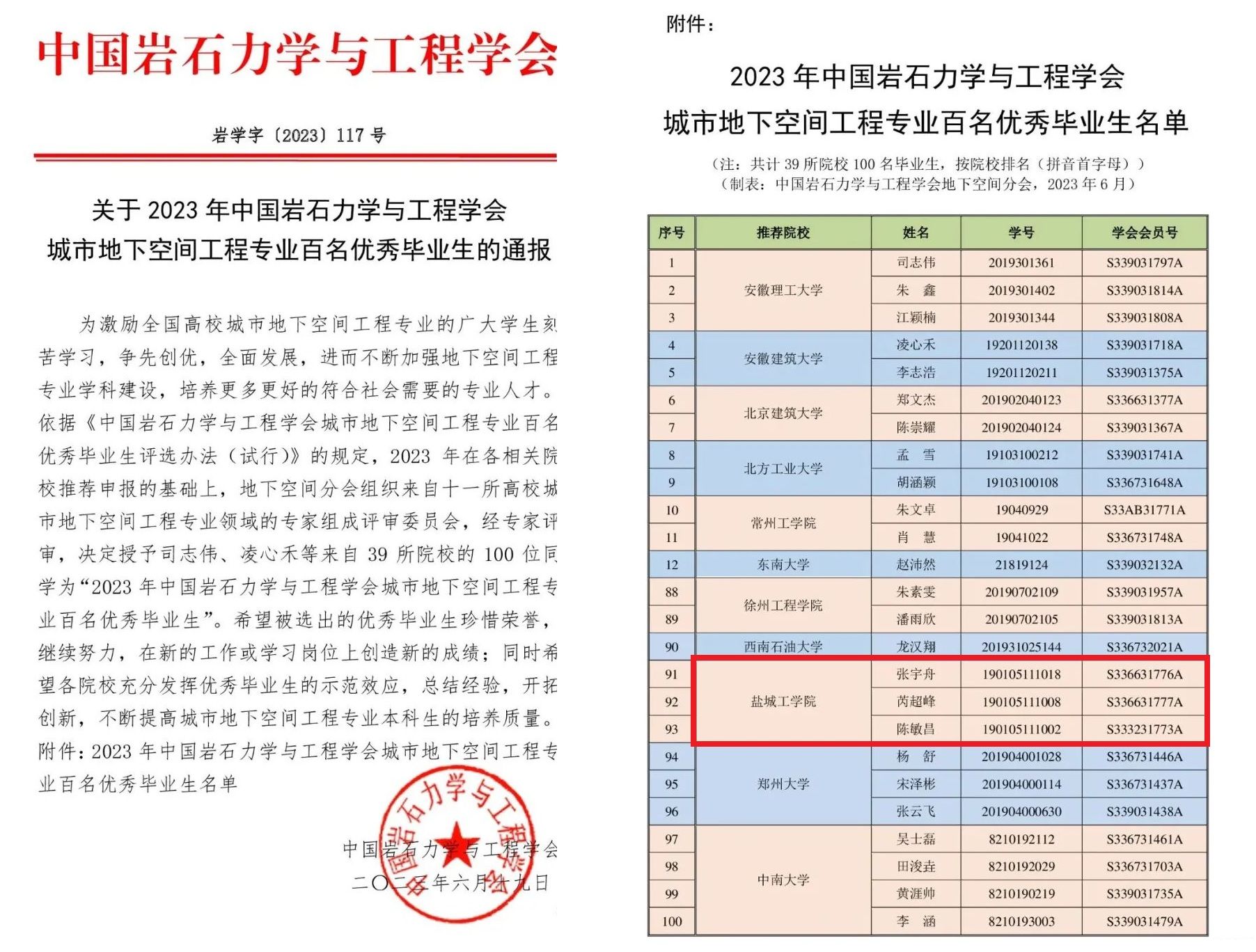 近日,中国岩石力学与工程学会公布了《关于2023年中国岩石力学与工程学会城市地下空间工程专业百名优秀毕业生的通报》,土木工程学院城市地下空间工程专业学生张宇舟、芮超峰、陈敏昌荣获“全国高校城市地下空间工程专业百名优秀毕业生”称号。