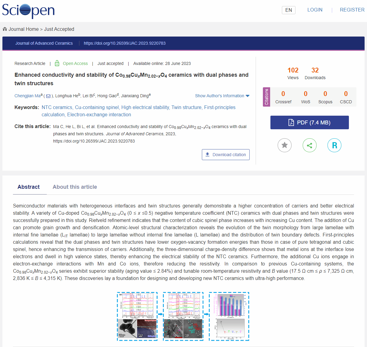 近日,我校分析测试中心马成建博士(第一作者及通讯作者)与南华大学毕磊教授合作,在陶瓷领域顶级学术期刊《Journal of Advanced Ceramics》发表题为《Enhanced conductivity and stability of Co0.98CuxMn2.02−xO4 ceramics with dual phases and twin structures》的研究论文(https://doi.org/10.26599/JAC.2023.9220783)。《Journal of Advanced Ceramics》是清华大学出版社出版的国际学术期刊,入选“中国科技期刊卓越行动计划”梯队期刊类项目。该期刊主要收录功能陶瓷研究领域最前沿的高端论文,是SCI “材料科学:陶瓷”分类中首个影响因子相继突破6.0、10.0及15.0的期刊,目前最新影响因子为16.9。