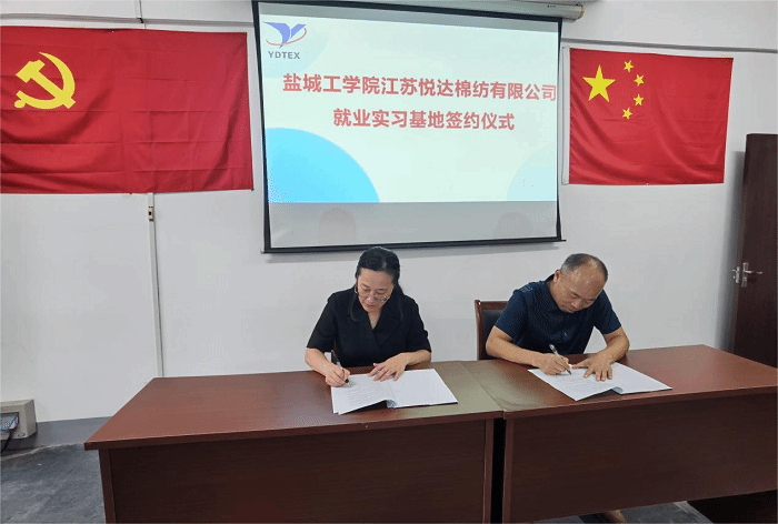 院长王春霞与江苏悦达棉纺有限公司副总经理孙九祥作为双方代表共同签订《就业实习基地共建协议书》并进行实习基地授牌仪式。