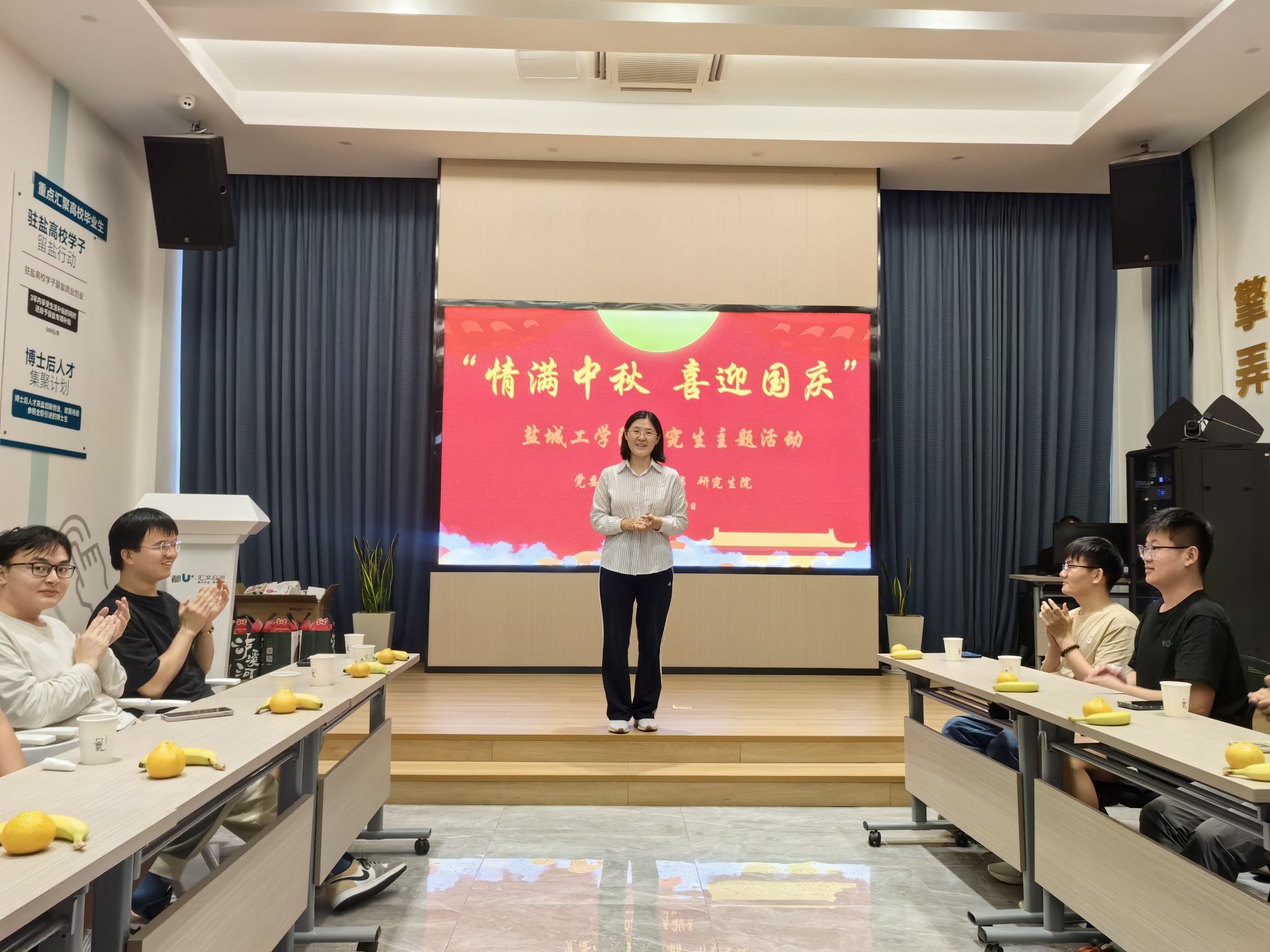 为欢度中秋,喜迎国庆,给假期留校的研究生送去温暖,9月29日下午,党委研究生工作部在汇文公馆共享中心一楼举办了“情满中秋 喜迎国庆”主题活动,党委研工部部长、研究生院院长许伟,研工部副部长、研究生院副院长刘正华,研究生管理办公室副主任李科,研究生辅导员薛凌云及留校的40余名研究生新生参加活动。