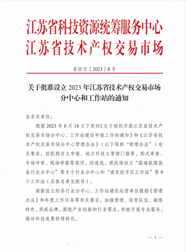 12月1日,江苏省科技资源统筹服务中心联合江苏省技术产权交易市场联合下发《关于批准设立2023年江苏省技术产权交易市场分中心和工作站的通知》(省技交〔22023〕8号),盐城工学院技术转移中心有限公司经自主申报、地方科技主管部门推荐、形式审查、专家评审、现场考察、汇报答辩等程序,被认定为“江苏省技术交易市场海洋可再生能源行业分中心”。