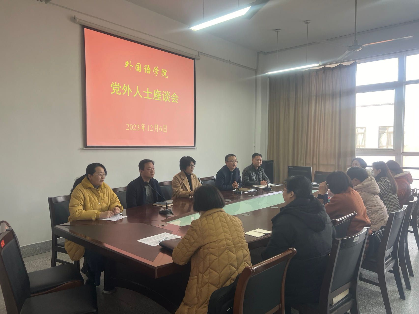 12月6日下午,在润美楼A404会议室内,外国语学院召开党外人士座谈会。会议传达学习上级文件精神,就学院事业发展和统战工作听取与会人员意见,学院党总支书记谷文华主持,党政班子成员和各民主党派、党外人士代表参加会议。