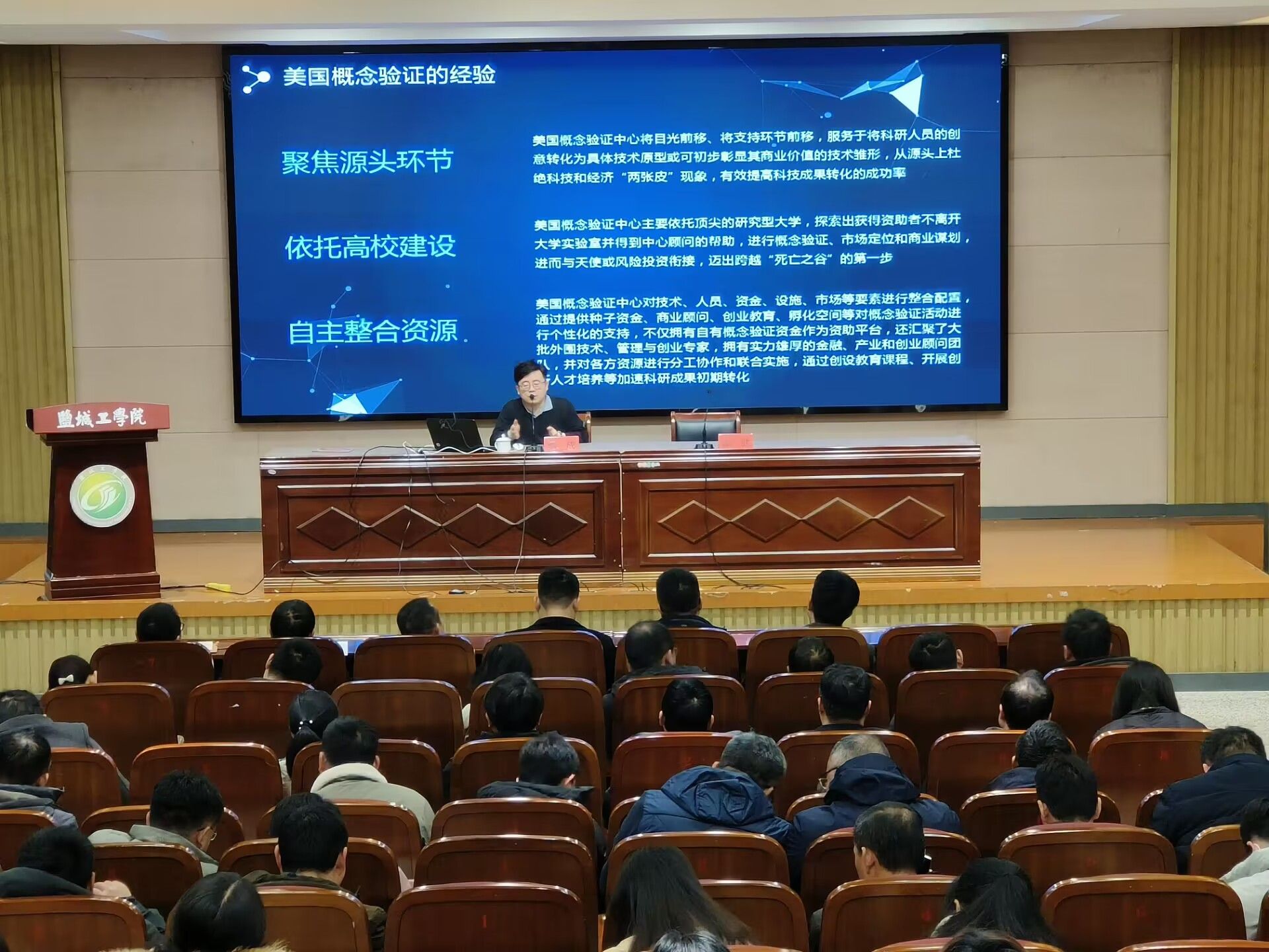 为进一步提高对概念验证的认识和理解,1月16日下午,学校邀请西安交通大学概念验证中心主任李成作“高校科技成果概念验证探索”专题报告。盐城市科技局以及各县市区科技局领导和相关科室负责人,我校各二级学院院长、分管科研副院长,各校级科研机构负责人以及骨干代表,科学技术处全体人员等100余人参会。我校科技处处长高健主持。
