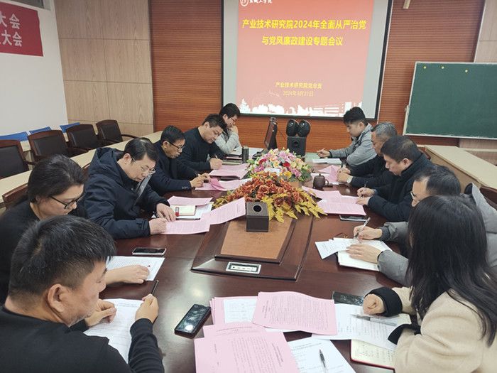3月27日下午,在北校区知达楼AE209会议室,产业技术研究院党总支召开2024年全面从严治党与党风廉政建设专题会议。研究院党总支书记、院长严金龙主持,党总支理论中心组全体成员参加。