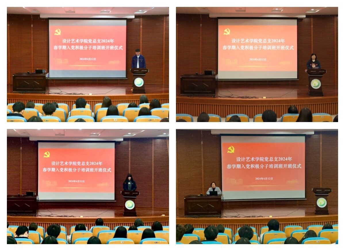 4月12日晚,设计艺术学院在润美楼报告厅举行2024年春学期入党积极分子培训班开班仪式。学院党总支书记胡凌霞出席并为学生上党课,学生党支部组织委员戴心怡、2024年春学期入党积极分子、学生党支部党员和青马班学员参加,活动由学生党支部青年委员王硕主持。