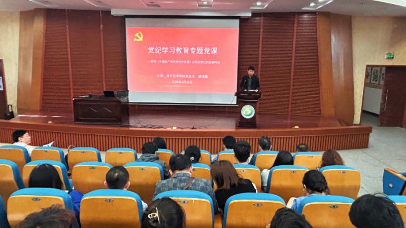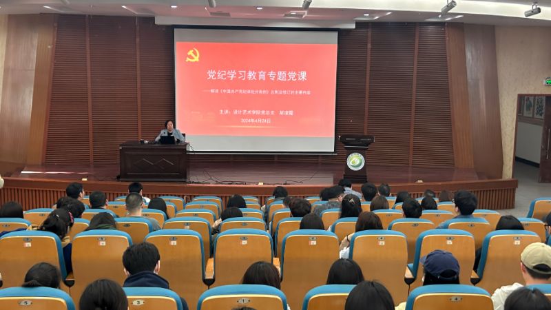 4月24日下午,在希望大道校区润美楼报告厅,设计艺术学院党总支书记胡凌霞为党员师生上党纪学习教育专题党课,解读《中国共产党纪律处分条例》总则及修订的主要内容。学院教工党支部书记钱峰主持会议并传达学校有关文件精神,师生党员等八十余人参加学习。