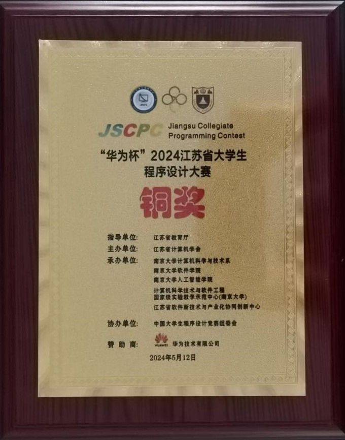 5月12日,“华为杯”2024江苏省大学生程序设计大赛在南京大学举办,吸引了全国56所高校的236支队伍参与竞技。我校由徐秀芳、徐森、黄曙荣三位老师指导的四支队伍参赛。经过五小时紧张而激烈的角逐,北巷清风队(张涛、戴赟、韩逸凡)摘银,参宿一队(刘雨凡、尹星星、黄子豪)夺铜,我校在全省44所参赛高校中荣获第20名。