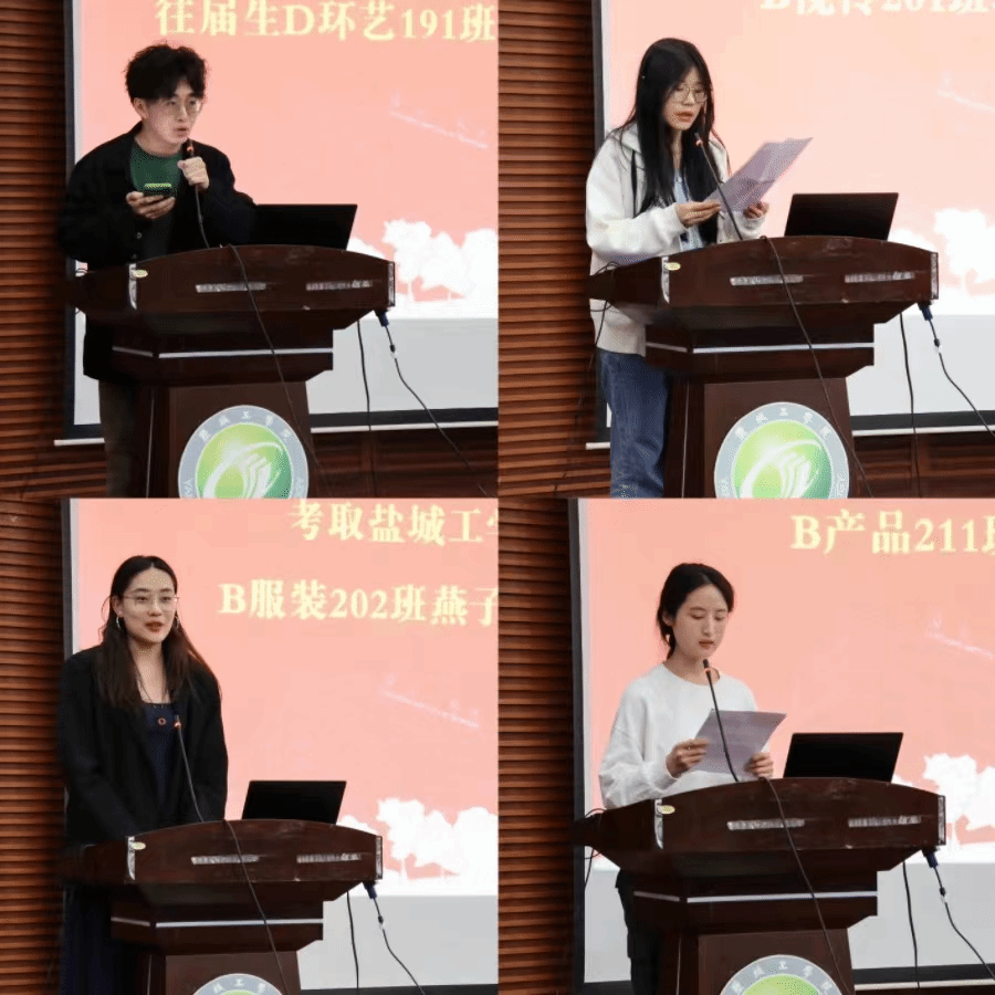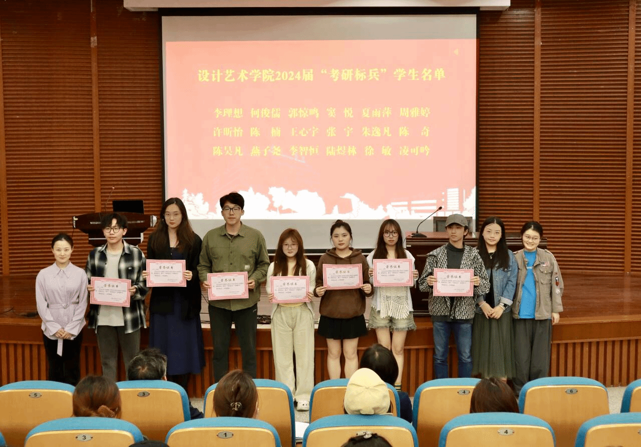 叶禎菲宣读《设计艺术学院关于表彰2024年考研优秀学生的决定》,并介绍学校出国留学硕士项目相关政策。与会领导和老师为考取研究生学生颁发“考研标兵”荣誉证书。考取研究生毕业生代表D环艺191班邹楚江、B视传201班郭惊鸣、B服装202班燕子尧依次分享各自的备考经验和收获感悟。21级考研学生代表B产品212班刘政楠作表态发言。