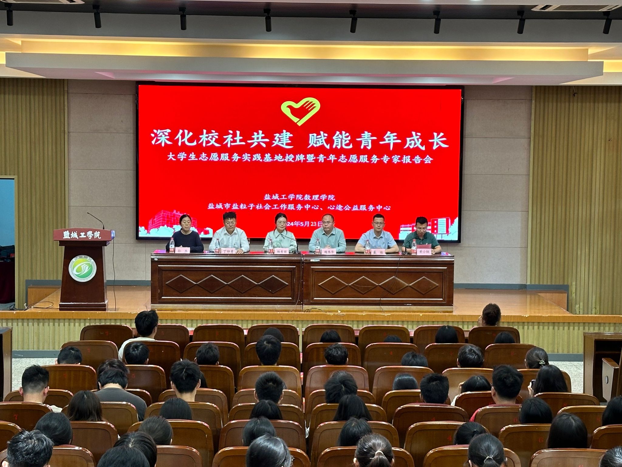 为深化志愿服务育人工作,引导广大青年大学生深入基层、奔赴一线,在奉献社会、服务人民中锤炼思想、体悟成长,勇做新时代的奋进者、开拓者、奉献者,5月23日下午,数理学院联合盐城市盐粒子社会工作服务中心、心途公益服务中心共同举办以“深化校社共建,赋能青年成长”为主题的大学生志愿服务实践基地授牌仪式暨青年志愿服务专家报告会。校团委书记杨秀丽,江苏好青年、盐城好人、盐城市心途公益服务中心理事长丁帅勇,副理事长戴维,数理学院党总支书记魏伟华,学工办主任孙杰以及学院大一、大二全体学生参加。活动由辅导员黄小钢主持。