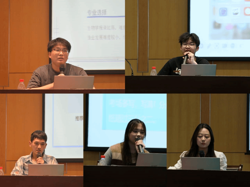 成浩、罗德诚、张译文、吉萌、韦轩等五位同学分享了他们专业选择、学习方法、时间分配、心态调整等方面的考研故事。