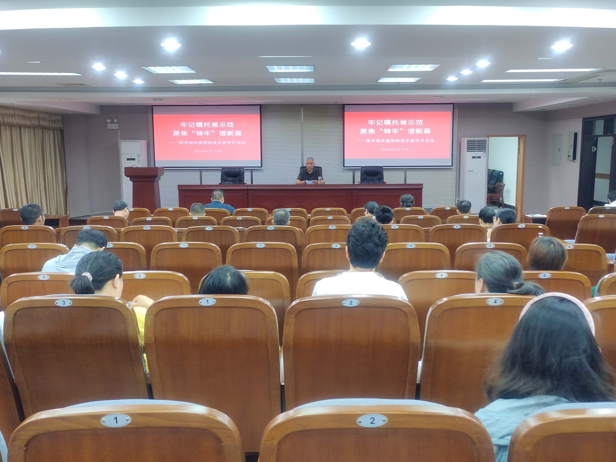 为认真贯彻落实习近平总书记关于加强和改进民族工作的重要思想,进一步深入学习宣传贯彻党的二十大精神,铸牢中华民族共同体意识,根据学校《关于开展全校民族团结进步宣传月活动的通知》精神,6月19日下午,图书馆在希望大道校区五楼报告厅,组织开展以“牢记嘱托做示范,聚焦‘铸牢’谱新篇”为主题的民族团结进步宣传月学习教育活动,党总支书记花爱军主持,全体职工参加。