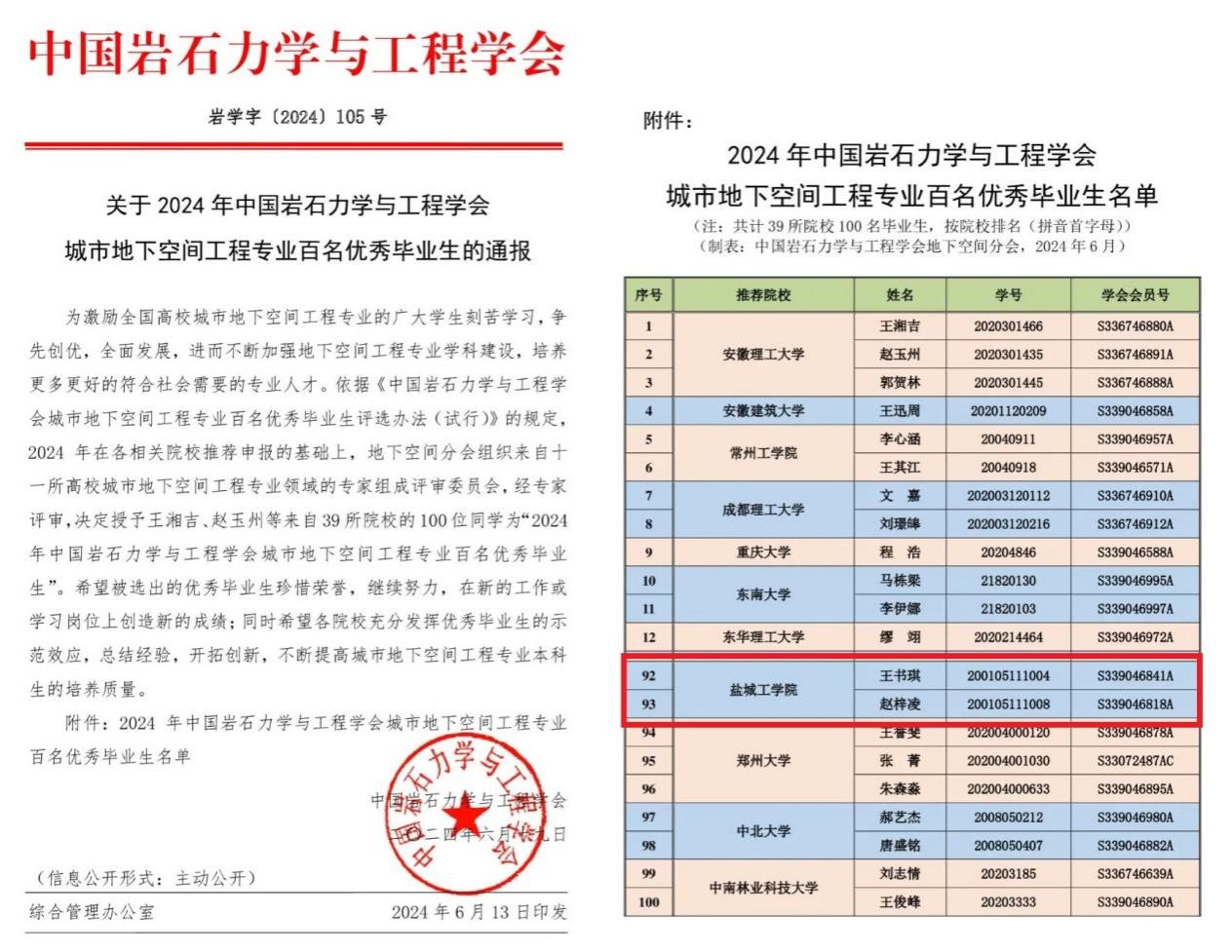 近日,中国岩石力学与工程学会公布了《关于2024年中国岩石力学与工程学会城市地下空间工程专业百名优秀毕业生的通报》,土木工程学院城市地下空间工程专业学生王书琪、赵梓凌荣获“全国高校城市地下空间工程专业百名优秀毕业生”称号。