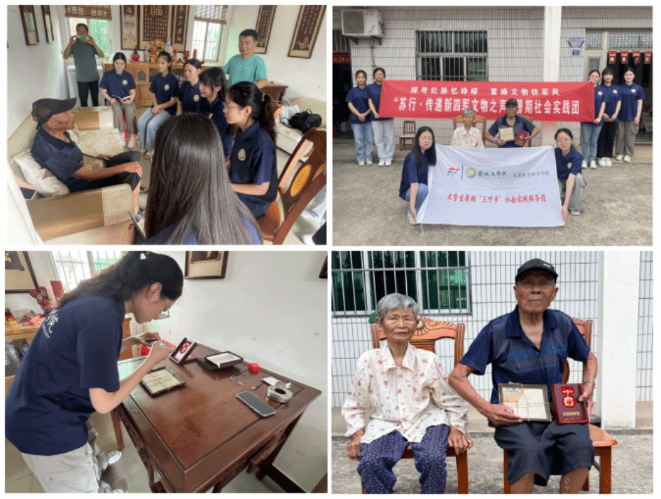 7月17日上午,盐城地区实践团赴亭湖区南阳镇曰康村和龙庙村开展调研访谈活动。在宋曰康烈士亲属宋金芝、南洋镇人武干事袁千介绍下,实践团参观了“红色印记”烈士陈列室,了解曰康村的由来以及宋曰康、徐彬等7名革命烈士的光辉事迹。实践团成员在与曰康村工作人员的座谈交流中,深刻领悟到陈列室文物所承载的爱国为民情怀,这种革命精神已然成为曰康村繁荣发展的动力源泉。在走访龙庙村之际,93岁抗战老兵倪月清向实践团展示自己珍藏的《华东军区退休军人证明书》及中央军委颁发的建国70周年奖章,讲述其作为司令部通讯员,冒着枪林弹雨传递作战机密的光荣使命,话语中透露着坚定的信念和无比的自豪。