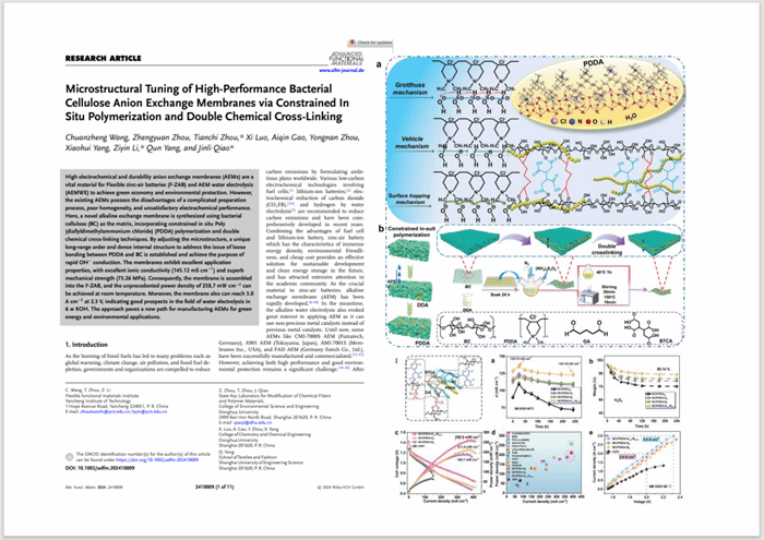 近日,我校纺织服装学院周天池教授课题组在材料领域顶级期刊《ADVANCED FUNCTIONAL MATERIALS》(简称“AFM”,中科院一区TOP期刊,影响因子18.5) 发表题为“Microstructural Tuning of High-performance Bacterial Cellulose Anion Exchange Membranes via Constrained In-situ Polymerization and Double Chemical Cross-Linking”的研究成果(DOI: 10.1002/adfm.202410009)。