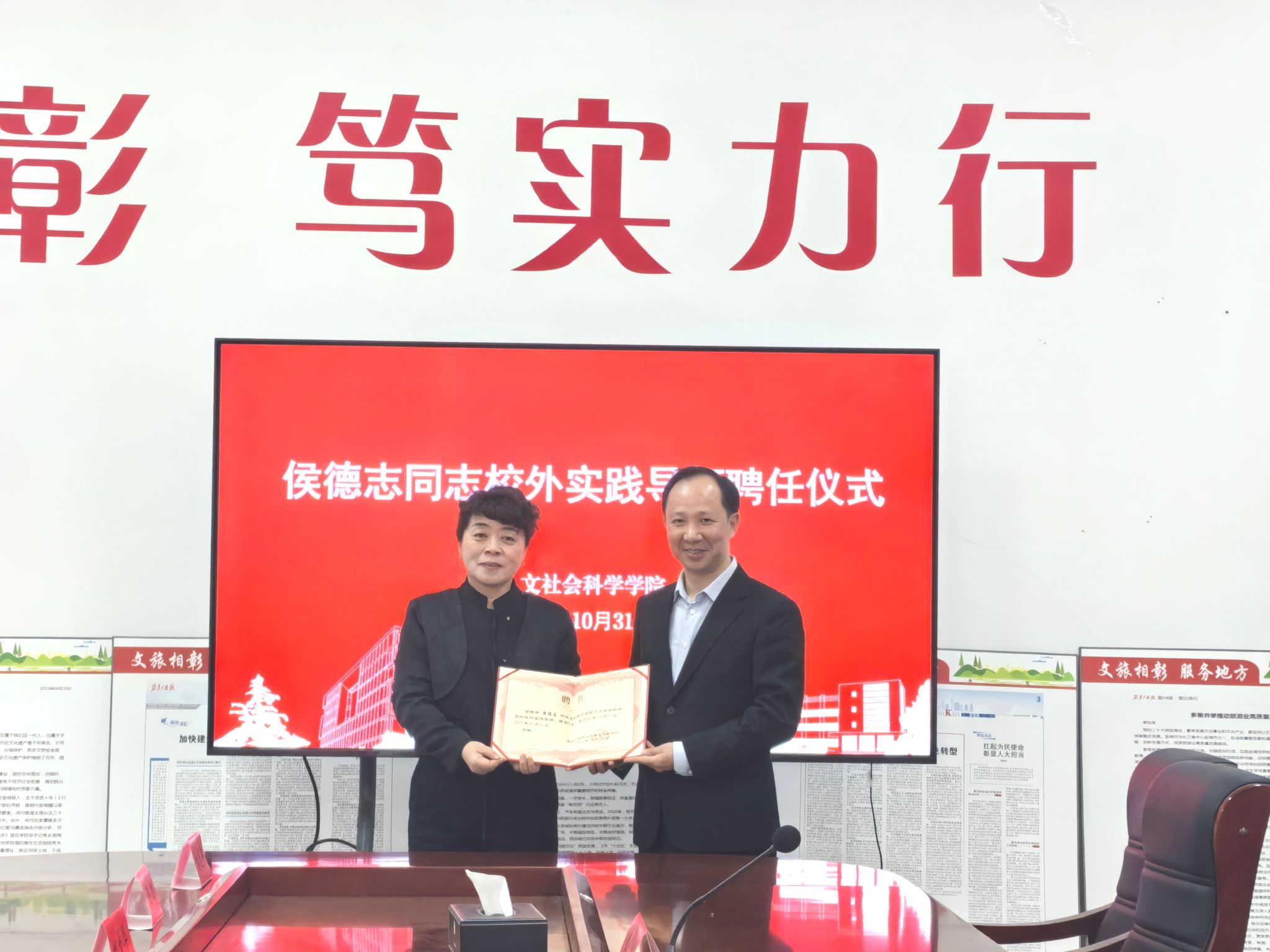 10月31日上午,盐城市文广旅局副局长侯德志一行来人文学院调研交流校地融合工作。院长周晓燕主持,党总支书记何登溢出席工作交流会。盐城市文广旅局推广处副处长陆汉耀、风光国际旅行社总经理邵俊、江苏万事航空集团有限公司总经理袁忠祥,以及人文学院副院长陶文俊、副书记姚爱华等参加交流会。人文学院聘任侯德志为校外实践导师。