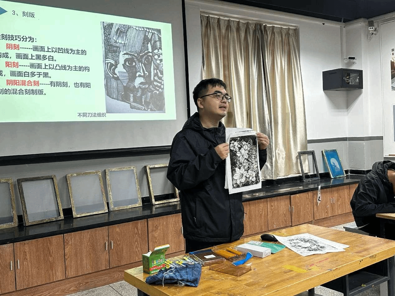 活动现场,设计艺术学院王辉老师为大家详细介绍了木刻艺术的起源、发展历程以及其在不同文化背景下的特色表现。从古老的民间木雕到现代的木刻版画,木刻艺术历经岁月洗礼,不断演变发展,始终散发着独特的魅力。