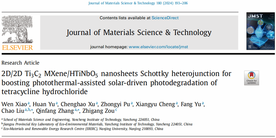 近期,根据Essential Science Indicators (ESI)数据库检索结果显示,我校材料学院研究生肖雯(第一作者)、刘超博士(通讯作者)和张勤芳教授(通讯作者),盐城工学院为第一单位发表在Journal of Materials Science & Technology(中科院一区Top,影响因子:11.2)的研究论文“2D/2D Ti3C2 MXene/HTiNbO5 nanosheets Schottky heterojunction for boosting photothermal-assisted solar-driven photodegradation of tetracycline hydrochloride”(J. Mater. Sci. Technol., 2024, 180, 193-206),被同时收录为ESI材料学科“高被引论文”(Highly Cited Papers)和“热点论文”(Hot Papers)。