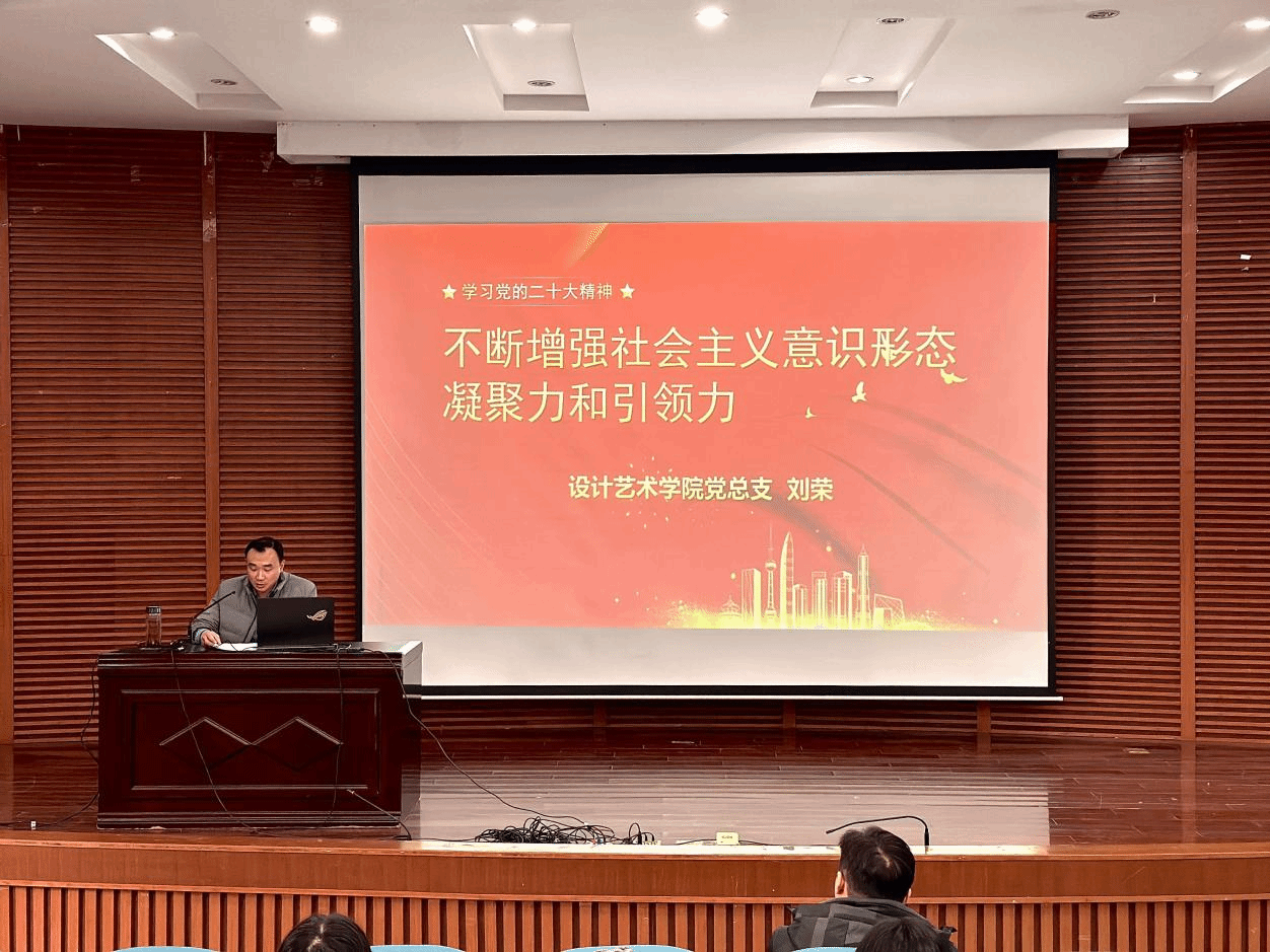 12月11日下午,在润美楼报告厅,设计艺术学院党总支开展“书记讲党课”活动,学院党总支书记刘荣为全体师生党员讲授意识形态专题党课。