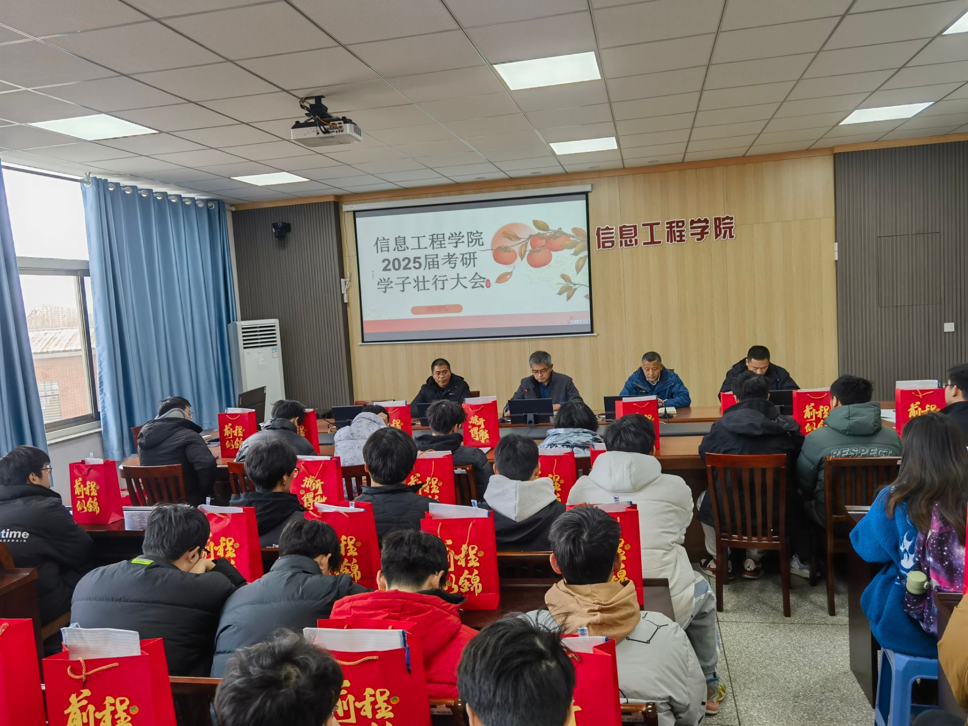12月18日上午,信息工程学院在怀德楼B410会议室召开2025届考研学生考前壮行大会。学院党委书记杨军、院长王如刚、副院长周锋出席,副书记王源主持。毕业班辅导员薛俊义、董金成以及2025届100余名考研学生参加。