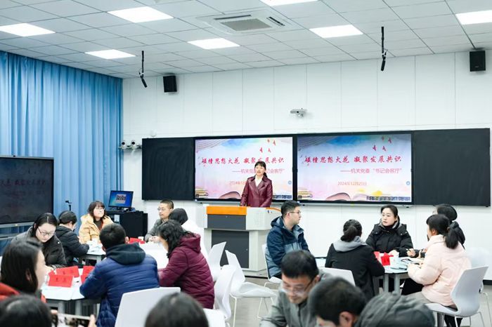 机关党委书记沈晓梅介绍了“书记会客厅”项目的建设初衷、活动内容及运行机制;通报了机关党委2024年度工作总结,交流了2025年工作思路。她表示,机关党委将在校党委的正确领导下,紧扣“一条主线”、突出“两个重点”、狠抓“三个提升”,推进“六项工程”,引领机关党支部和广大党员,奋力书写以高质量机关党建助推学校事业高质量发展新局面。