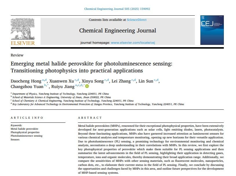近日,我校数理学院洪道程博士(第一作者)和姜瑞雨教授(通讯作者)与济南大学原长洲教授合作,以盐城工学院第一单位,在化工领域TOP期刊Chemical Engineering Journal(IF = 13.4)上发表题为Emerging Metal Halide Perovskite for Photoluminescence Sensing: Transitioning Photophysics into Practical Applications的学术论文。