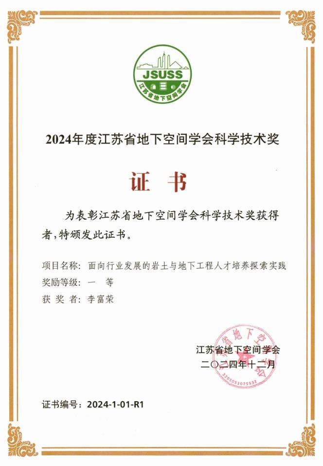 大会颁发了2024年度江苏省地下空间学会科学技术奖,由李富荣牵头申报的“面向行业发展的岩土与地下工程人才培养探索实践”获软科学研究类一等奖,王照宇团队牵头申报的“微生物强化地下能源土传热关键提升技术及机理研究”获技术发明和技术开发类二等奖,王照宇团队完成的“微生物法强化U型地埋管蓄能传热特性的实验研究”获优秀论文三等奖。会议期间,李富荣介绍了我校城市地下空间工程专业建设、人才培养、参与学会活动情况,并与参会的相关高校及企业的领导、专家进行了充分交流。