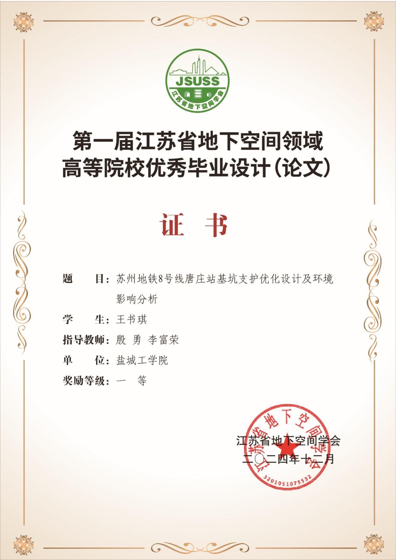 在本次评选中,由土木工程、城市地下空间工程、工程管理专业学生组成的团队(指导老师:李富荣、张飞、殷勇、赵海春)获优秀毕业设计团队一等奖,城市地下空间工程专业王书琪(指导老师:殷勇)、万里鹏(指导老师:王照宇)和徐至威(指导老师:程昀)分别获个人优秀毕业设计(论文)一等奖、二等奖、二等奖,获奖数量位居省内高校前列。