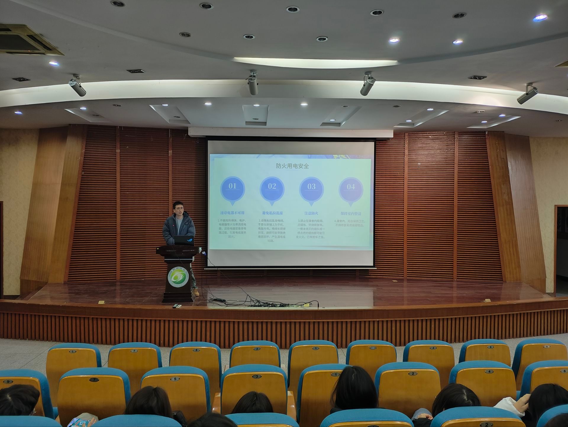 主题班会着重强调了宿舍安全的重要性,尤其将宿舍防火安全教育作为重中之重。通过展示触目惊心的真实案例,详细讲解了高校宿舍因使用明火器具、违规存放易燃物、违规电器使用等行为可能引发的安全隐患,专项讲解了宿舍火患预防要点,明确禁止使用蜡烛、酒精炉等明火器具,严禁在宿舍内存放烟花爆竹、高浓度酒精等易燃易爆物品。提醒同学们严格遵守宿舍管理规定,做到人走断电、规范用电,确保消防通道畅通无阻。同时,还就宿舍卫生、文明礼仪等方面进行了细致指导,倡导同学们营造整洁、和谐的宿舍环境。
