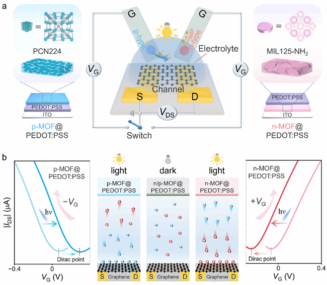 石墨烯光电化学晶体管(Graphene Photoelectrochemical Transistor, GPECT)作为一种新兴技术,巧妙融合了光电化学(PEC)与液栅型石墨烯晶体管(SGGT)的工作原理,能够实现光-电-生物识别事件的相互关联,兼具光电化学生物传感的高信噪比和高灵敏度特性。基于此,王成双教授联合南京大学赵伟伟教授设计并开发了GPECT器件,其具有双向信号增强型生物传感功能,在光激发下分别利用p/n型MOFs@PEDOT:PSS作为光敏栅极,调控器件转移曲线和沟道电流等特性,通过生物催化沉淀策略实现对凝血酶的高灵敏检测。该双向信号增强型生物传感器不但具有低背景、高灵敏度等特点,而且能够利用两个信号间交叉验证来提升检测的可靠性。本研究开发的p/n型MOFs栅控GPECT生物传感器件,展示了其作为通用生物传感平台的可行性和独特光敏栅极在新型光电子学领域的潜力。
