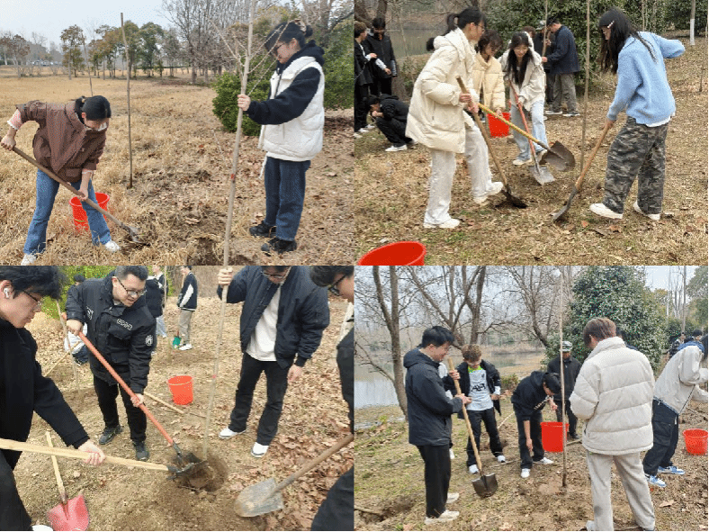 活动当天,学院团员青年与老师们一同手持铁锹、水桶等工具,在预定区域开展植树活动,大家热情高涨,干劲十足,分工明确,有的挥锹铲土,有的搬运树苗,有的提水浇灌,经过不懈努力,50株树种被种下,为校园增添了一抹新绿。植树过程中,师生们依据银杏树的生长习性,精心规划种植间距,确保了树木的健康成长。