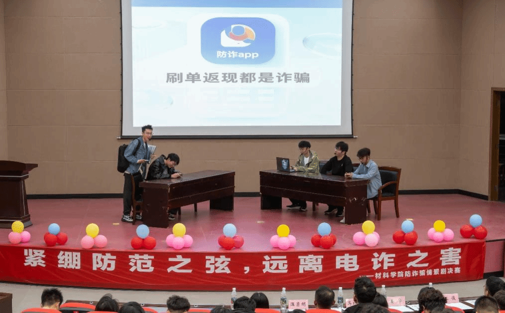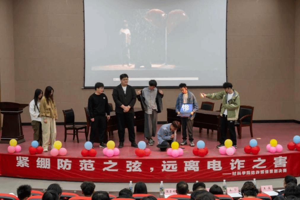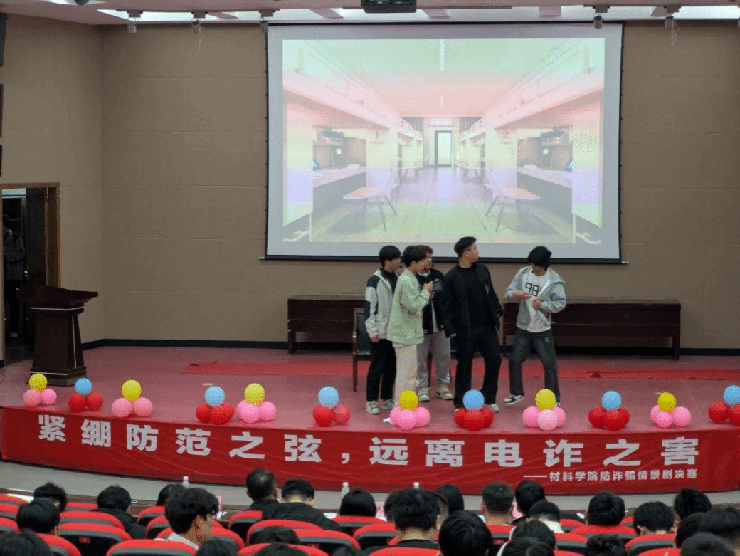 为增强大学生的安全防范意识,增强识别和应对电信网络诈骗的能力,切实保障学生的财产安全。4月8日晚,材料学院在北校区五四报告厅举办“紧绷防范之弦,远离电诈之害”电信诈骗情景剧决赛。本次决赛特邀学生处副处长马晓英、研究生院副院长姜华,材料学院党委副书记温崇明、学工办主任王俊、团委副书记袁梅担任评委,2024级400余名学生现场观摩。