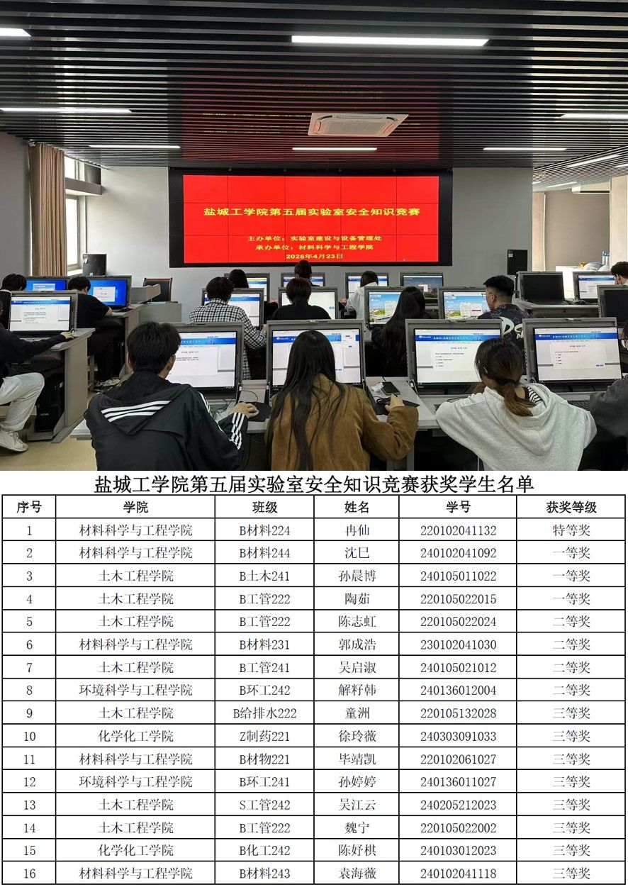 为加强校园实验室安全管理,普及实验室安全知识,增强师生安全防范意识,4月23日下午,由实验室建设与设备管理处主办、材料科学与工程学院承办的“盐城工学院第五届实验室安全知识竞赛”在建军东路校区知达楼虚拟仿真实验室举行。