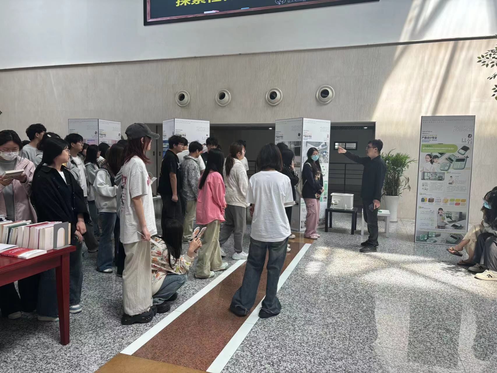 5月12日,我校设计艺术学院2025届产品设计专业毕业设计展在南校区图书馆二楼中庭开幕。本次展览将持续9天,主题是“制器载道•设计向新”,展出该专业近三十组学生作品。为做好本次展览,图书馆突破传统服务边界,将中庭空间改造为“沉浸式设计实验室”,依托图书馆建筑特色,通过无隔断的通透视野,打造出集作品展示、互动体验、学术交流于一体的复合空间。