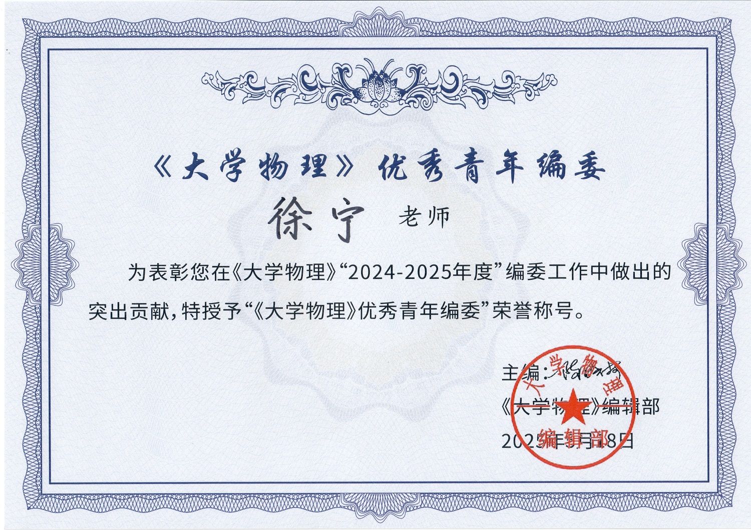 会议期间,经专家委员会评审,遴选出优秀青年编委及2022-2024年度优秀学术论文。徐宁教授凭借突出的学术贡献获评“优秀青年编委”。此外,他与吴锋副教授合作的教研论文《类锂原子激发态能量的双参数微扰法研究》荣获“2022-2024年度优秀学术论文奖”。该研究创新性地提出了双参数微扰计算方法,为原子物理领域的理论探索提供了新思路。