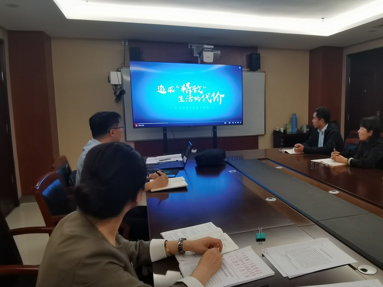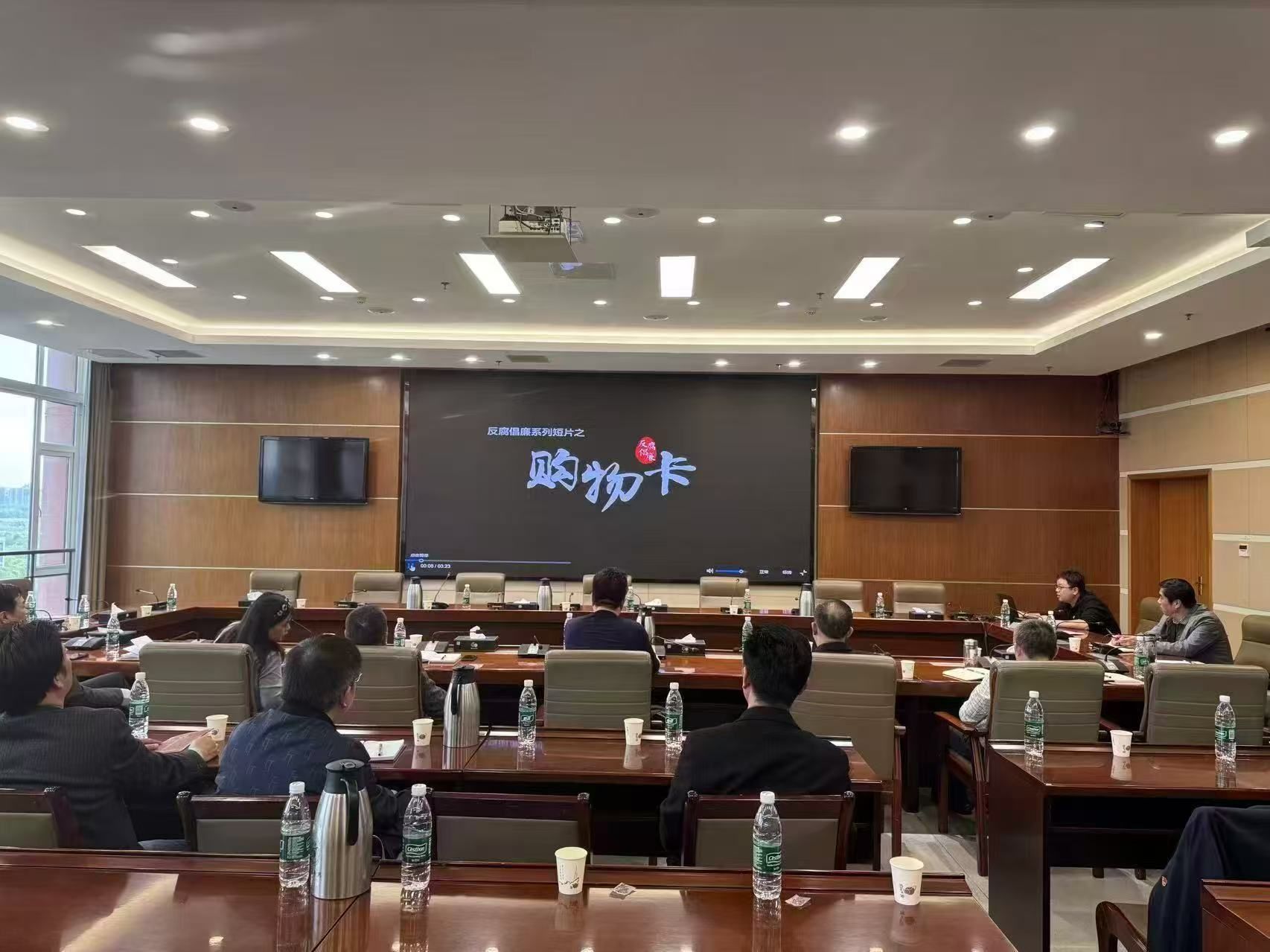 与会人员集体观看了《购物卡》《一篇论文》《家声》等廉政教育视频。