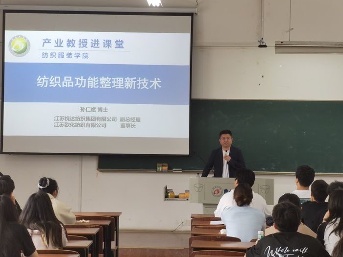 为了深化校企合作,推进产教融合,进一步提升轻化工程专业本科人才培养质量,5月24日下午,纺织服装学院邀请省产业教授孙仁斌博士以“纺织品功能整理新技术”为主题,为轻化工程专业学生讲授了一堂理论与实践紧密结合的专业课。
