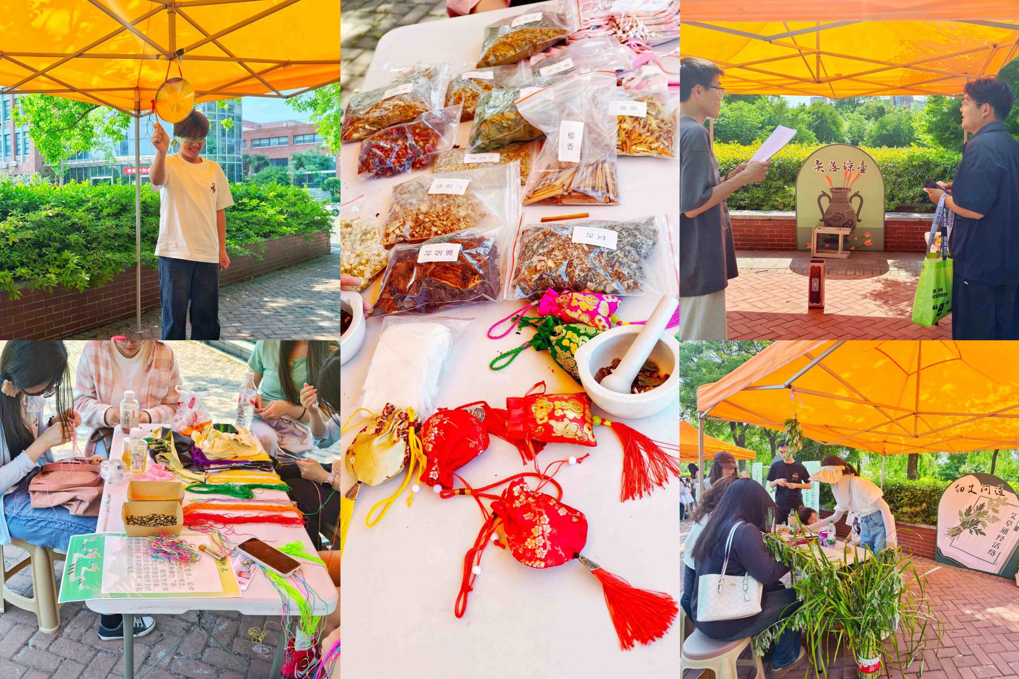 传统手工艺体验区则是一片温馨而富有创意的天地。“彩缕祈祥”五彩绳编织摊位前,志愿者们耐心细致地指导同学们将红、黄、蓝、白、黑五色丝线巧妙交织。在志愿者的帮助下,一根根寓意吉祥的五彩绳在同学们的指尖诞生,不仅为节日增添了一份喜庆,更让大家感受到传统手工艺的独特魅力。“香绾端阳”香囊制作区人气爆棚,最受师生欢迎。大家根据自己的喜好,精心挑选艾叶、丁香、白芷、檀香等传统香料,装入精美的香包中。在制作过程中,同学们相互交流、分享经验,亲手制作出既实用又美观的端午香囊,将满满的祝福与心意融入其中。“纫艾问道”制作区的艾草花束摊位前,同样热闹非凡。同学们将新鲜艾草精心捆扎成束,搭配端午祝福书签、流苏、丝带等装饰,创作出独具特色的国潮“包挂”。这些作品不仅展现了同学们的创意与巧思,更传承了端午时节悬挂艾草驱邪祈福的传统习俗。