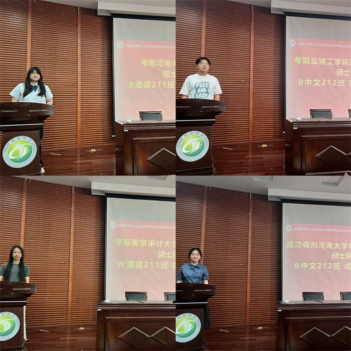 会上,考取河海大学社会学专业硕士研究生、B酒店211班夏盈盈同学从择校、初试、复试这三个角度,提醒同学们要脚踏实地,厚积薄发并祝愿2022级考研学子金榜题名,高分上岸。考取盐城工学院国际中文教育专业硕士研究生、B中文212班吴康纯同学从个人情况及报考本校研究生优势两个方面展开讲述,鼓励学弟学妹们“相信自己的实力,相信母校的培养——选择本校,就是选择高效成功!”。考取南京审计大学公共管理专业硕士研究生、W酒店211班郑项悦同学结合自身从专科到本科,再从本科到研究生的经历,鼓励学弟、学妹们“把书背烂,把题刷烂,克服苦难,一定上岸!”。成功调剂并考取河南大学中国语言文学专业硕士研究生、B中文212班成宜吉同学从调剂原因、调剂择校、调剂复试三个方面向大家进行考研调剂的讲解,并鼓励大家不要轻言放弃,坚持就是胜利。
