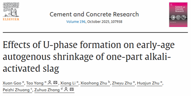 近日,我校材料科学与工程学院高璇老师在建筑材料领域顶级期刊Cement and Concrete Research(中科院一区TOP,影响因子10.9)上发表题为Effects of U-phase formation on early-age autogenous shrinkage of one-part alkali-activated slag的研究论文(DOI: 10.1016/j.cemconres.2025.107938),盐城工学院为第一单位,杨涛副教授为论文的通讯作者,盐城工学院绿色建筑材料研究所朱哲誉老师和诸华军教授为相关研究工作提供了重要指导。