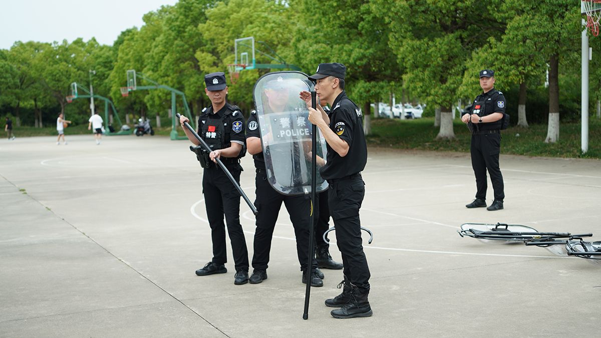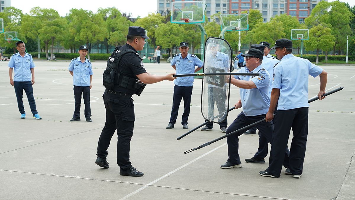 徐荣讲解了突发事件的基本知识及应对手段,围绕防卫战术、防卫器械使用等方面进行了实际操作技能培训。特警队员详细演示了校园发生紧急情况时防暴盾牌、长棍、钢叉等各类警械设备的使用方法和操作要领。参训人员进行现场模拟演练,通过“上手”体验的形式,利用盾牌、钢叉等器械组成战术队形进行防御,熟悉器材使用方法和战术小组的实战要求,第一时间控制现场,全程处置规范有效。